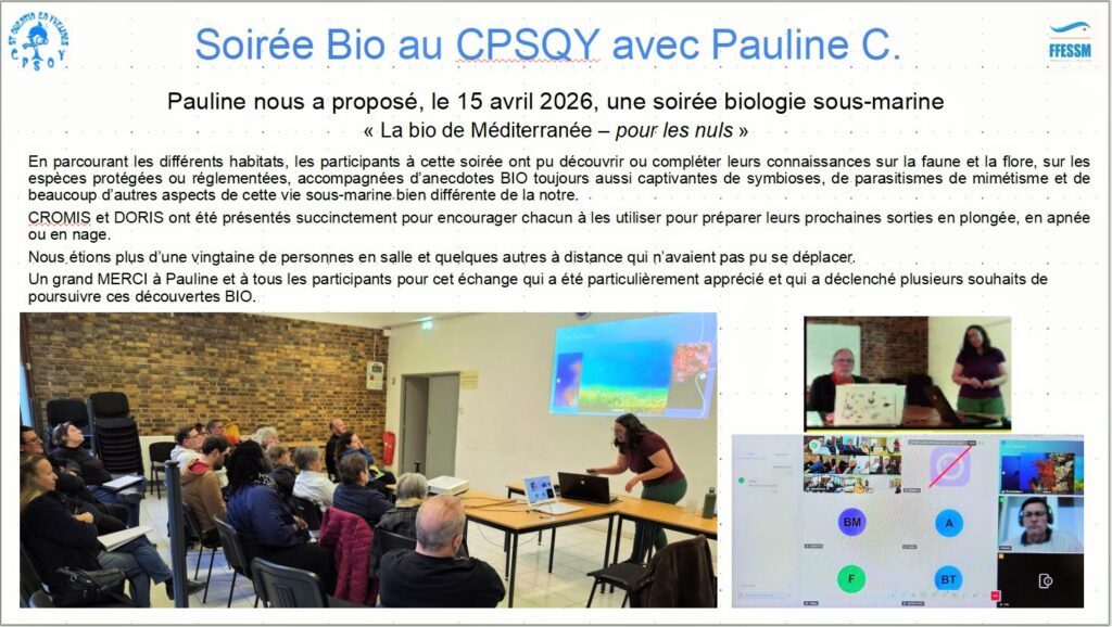 La Commission Bio FFESSM78 (EBS : Environnement et Biologie Subaquatiques) a eu le plaisir de rencontrer les membres du club de plongée SQY de Saint‑Quentin‑en‑Yvelines pour une véritable immersion au cœur de la faune et de la flore méditerranéennes.